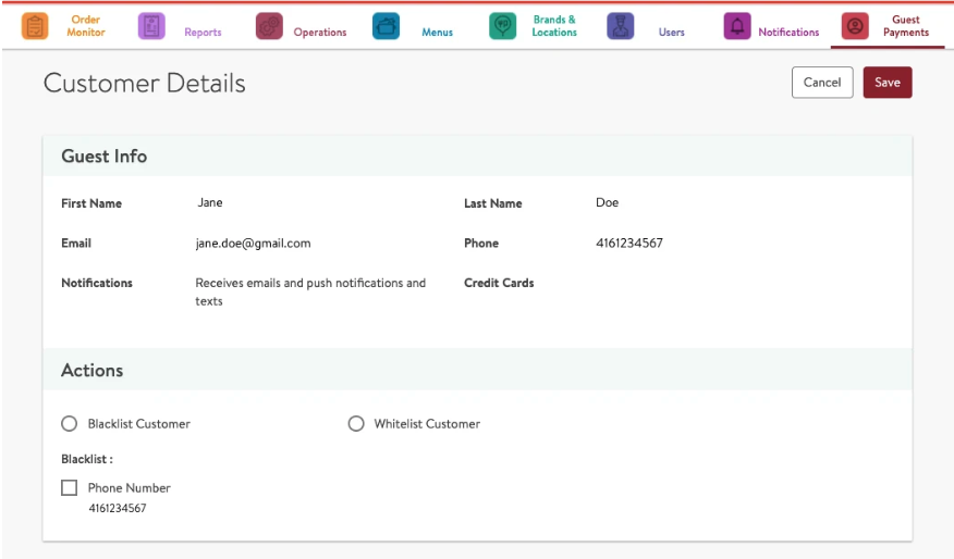 - Under Actions, blacklist the customer using the available buttons. You can also blacklist the phone number associated with the account or, if applicable, the delivery address.