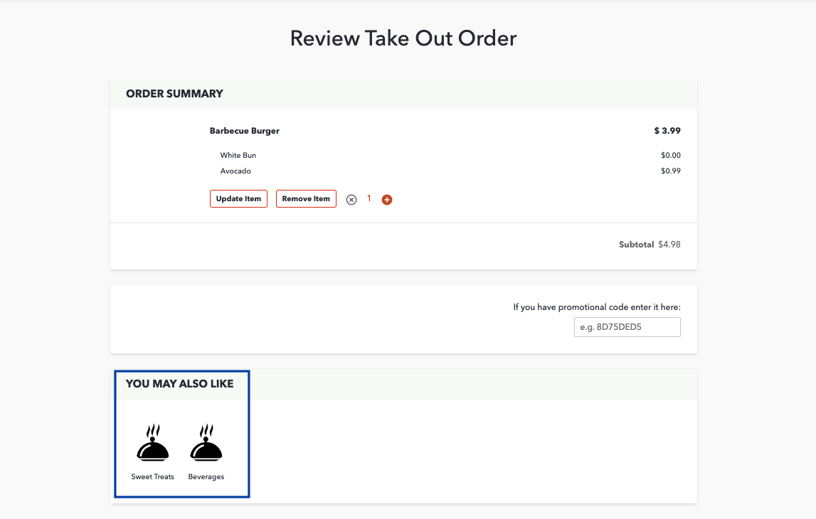 Category upsells are categories that are recommended to users based on the items they have added to their cart. Only categories from menus with the same order type may be assigned 9ie. takeout menu upsells apply only to takeout orders). Upsell categories are displayed on the checkout page (under 'You May Also Like').